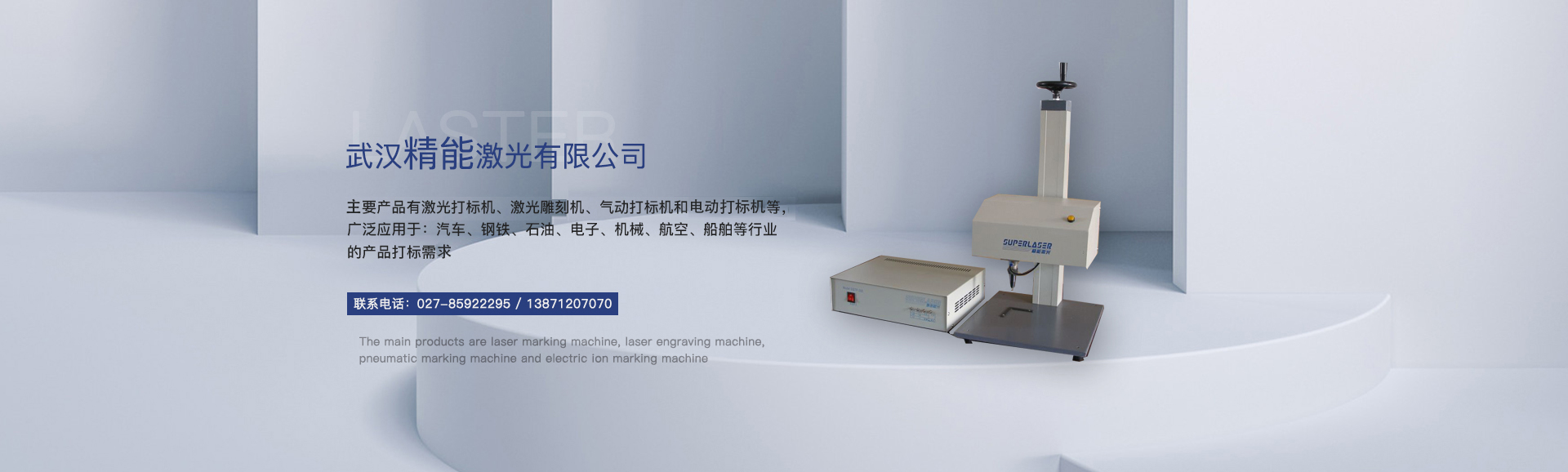 武汉精能激光有限公司地处武汉市黄陂区,专业致力于为各类工业企业提供优质产品标记设备,主要产品有激光打标机、激光雕刻机、气动打标机和电动打标机等,广泛应用于:汽车、钢铁、石油、电子、机械、航空、船舶等行业的产品打标需要。